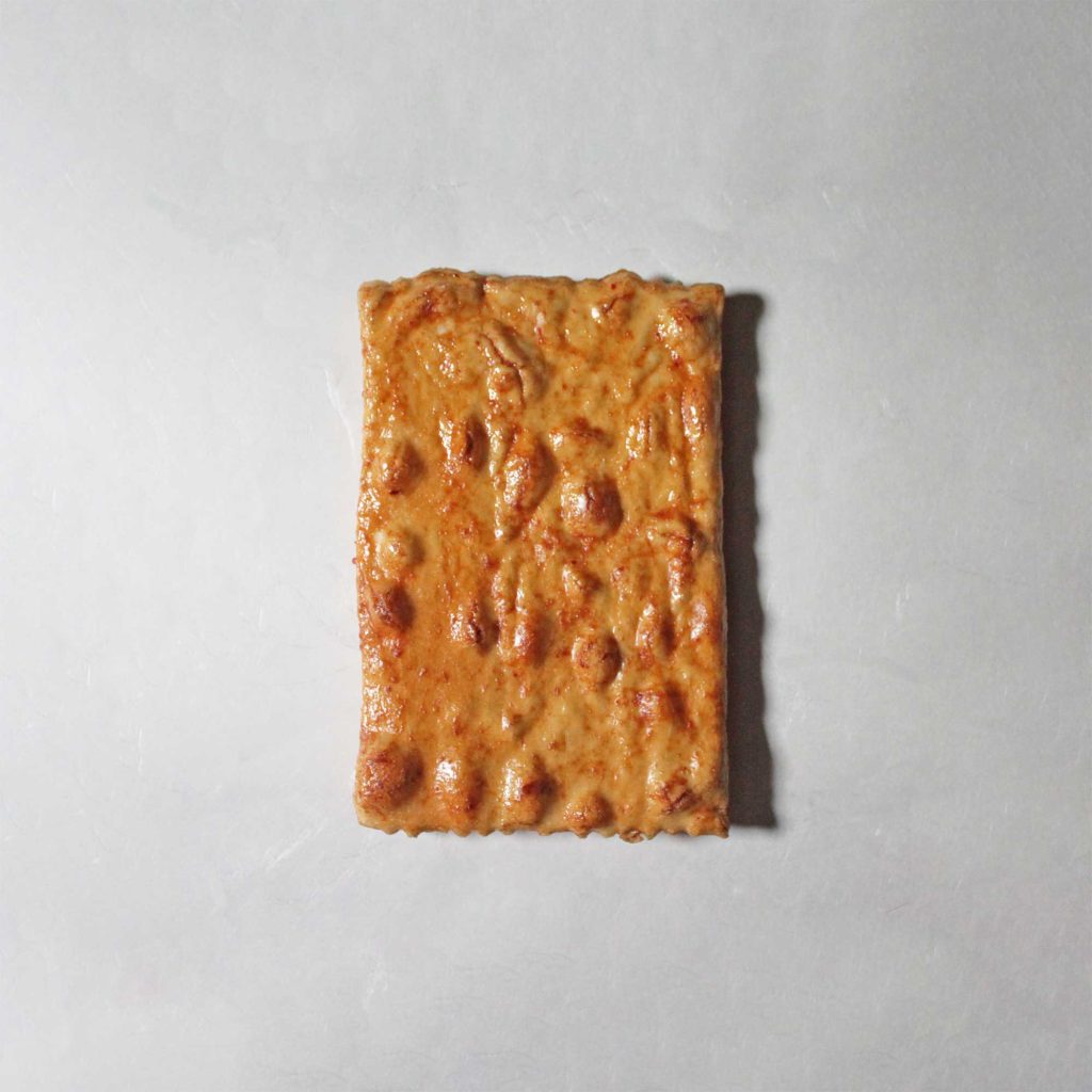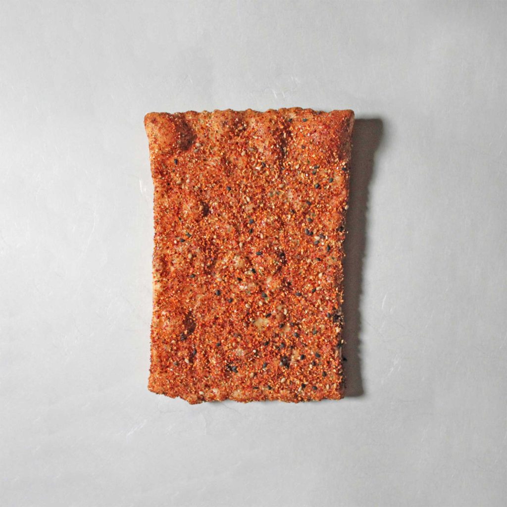 手焼き・堅焼き煎餅。特製醤油だれと七味唐辛子をたっぷりふりかけた、辛さ際立つ煎餅。