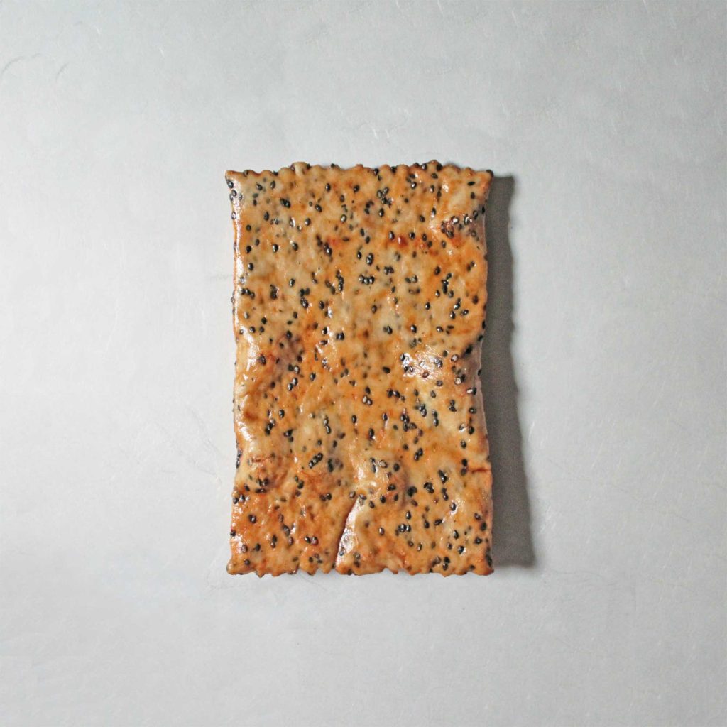 手焼き・堅焼き煎餅。黒ごまを生地にたっぷり練り込み、特製醤油ダレで味付けた、胡麻の香ばしさ広がる煎餅。